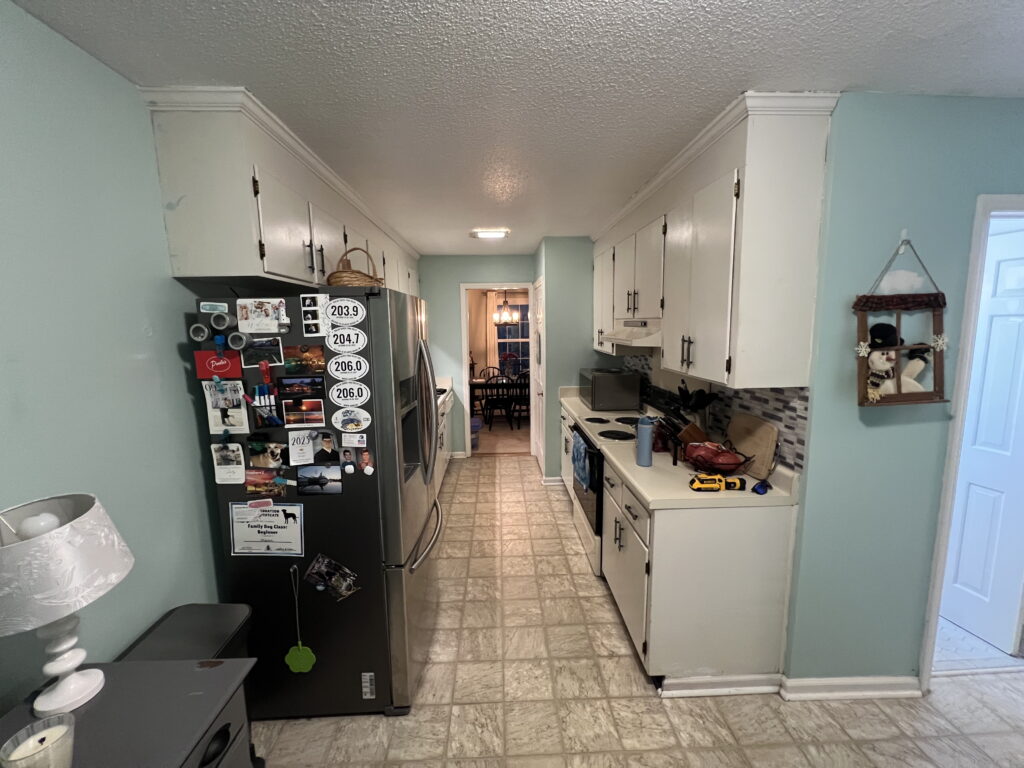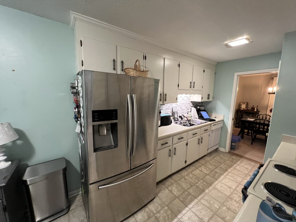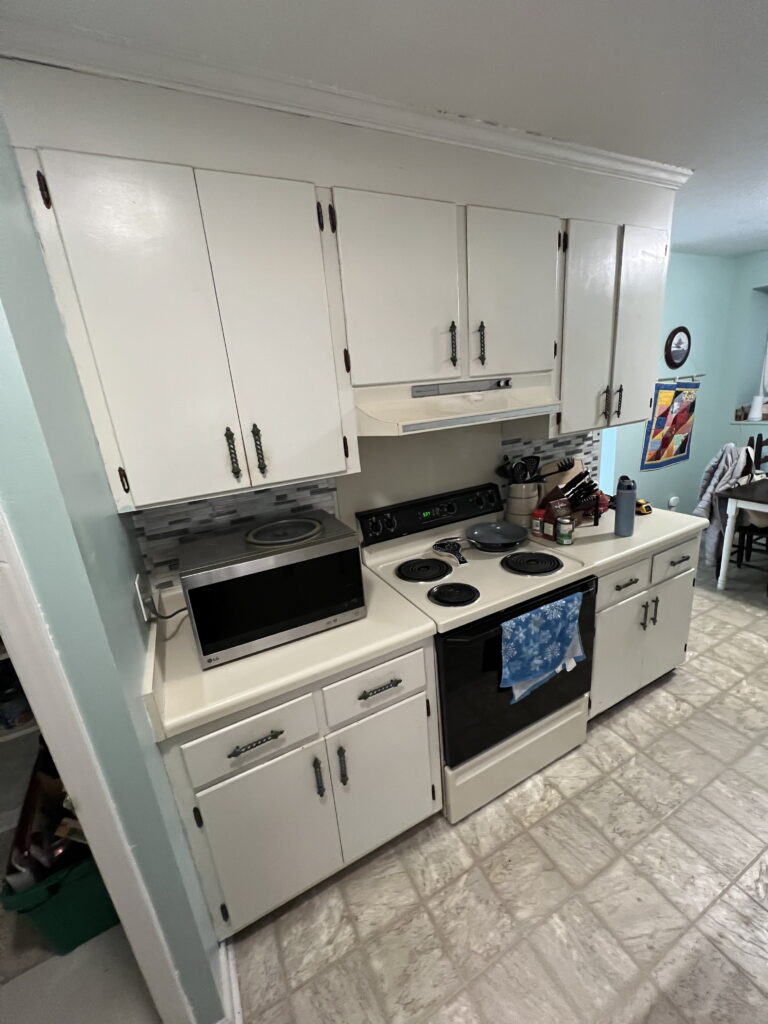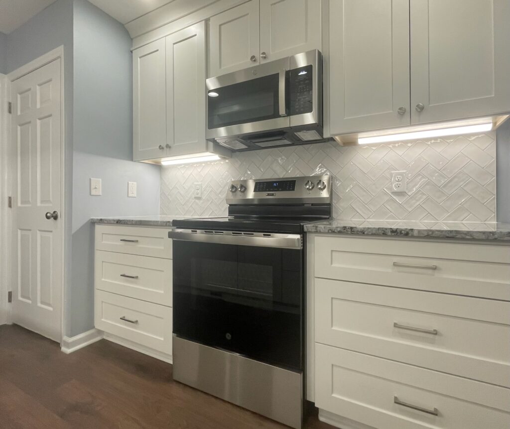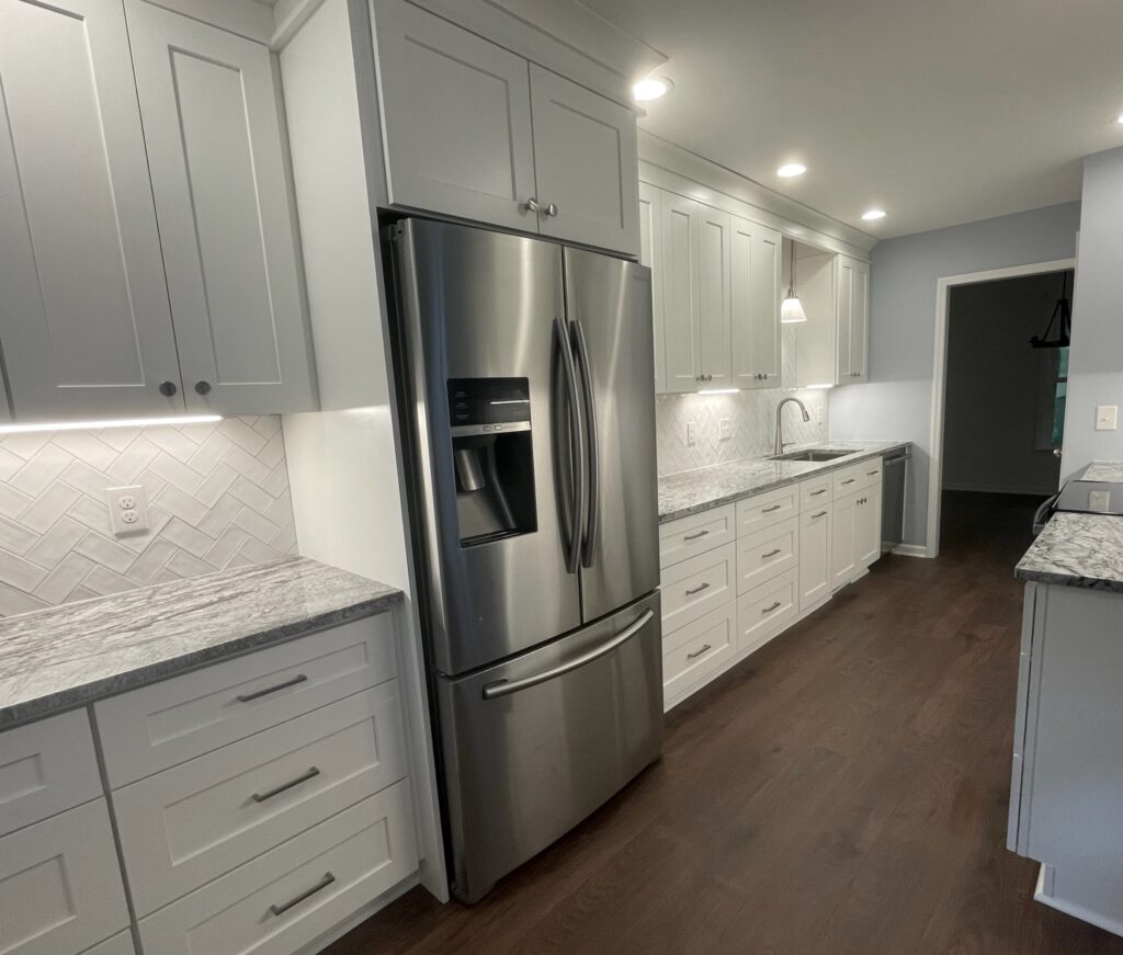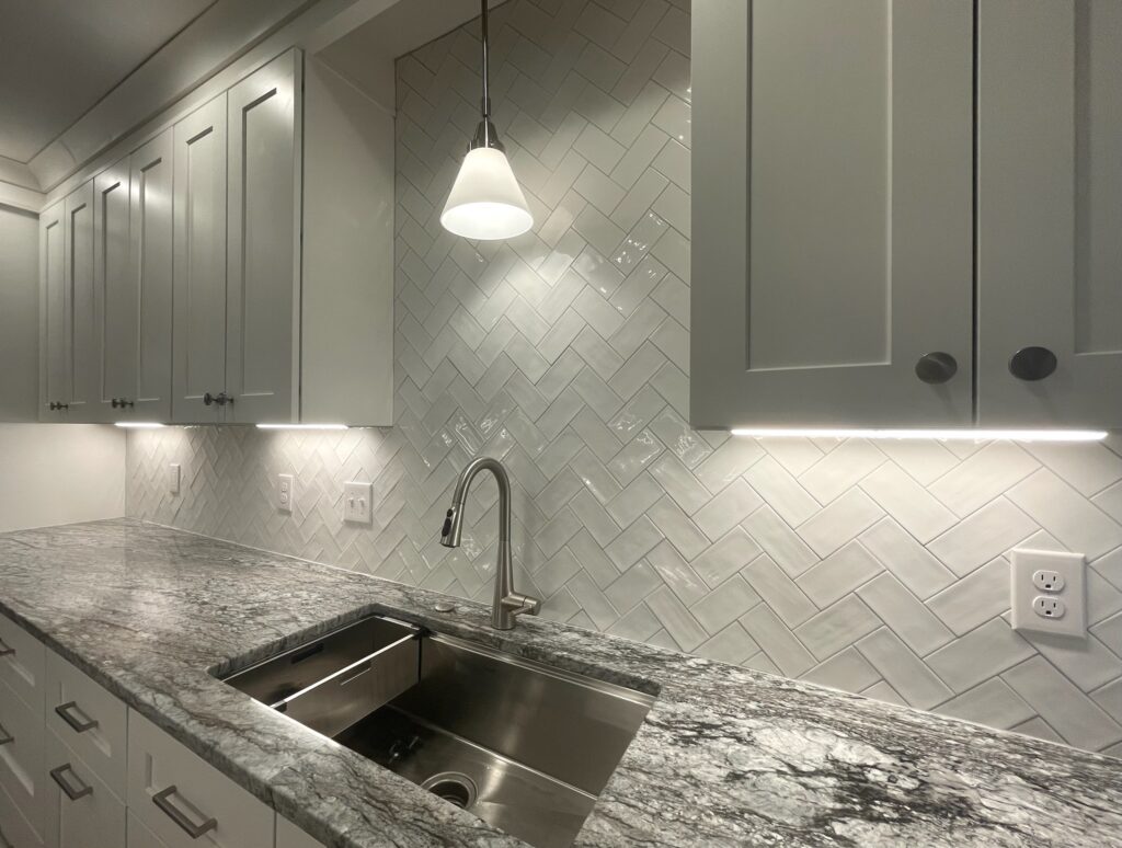This kitchen remodel proves that narrow kitchens can be just as stylish and practical as larger layouts. The combination of a herringbone subway backsplash, new cabinets, Blue Dunes granite, and expanded work space creates a kitchen that feels modern, inviting, and highly functional.
